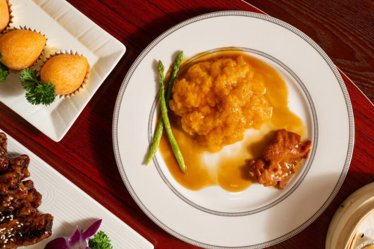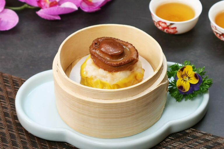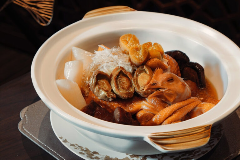 主菜則以各地珍饈美饌引領味蕾,既有令人難以忘懷的滋補佳品,也有淮揚家宴與節慶必備的美味。人氣推介不可錯過:「劉姥姥鴿蛋繡球」,豆腐刀工與文學典故的絕妙融合。將豆腐細切成繡球花狀,極考刀工,鴿蛋自古已有宮庭珍品之稱,《紅樓夢》中就有劉姥姥嚐鴿蛋的描述,兩者加入以瑤柱、金華火腿絲鮮製的金湯,頓成一道國宴料理;「金湯雞頭米牡丹蝦球」,雞頭米與南瓜泥共熬成金黃濃湯,口感綿密帶天然甘甜。牡丹蝦球則取蝦背剖花,油炸後形似牡丹。雞頭米的滋補、南瓜的溫潤與蝦球的鮮甜層疊交融,回味無窮;「鮑汁芋奶扣花膠」,融合多重精華的滋補佳餚,花膠肉質飽滿且膠質豐盈,鮑汁以老雞、金華火腿及乾鮑慢火熬煮數小時,搭配以荔浦芋頭製作的芋奶,花膠吸盡鮑汁精華,軟糯彈牙,滋補而不膩。