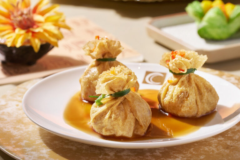 今個盛夏,國金軒推出「粵韻素珍養生宴」(原價每位HK$528),嚴選被譽為菌中之王的雲南頂級野生松茸與白舞茸菌,打造精緻素食體驗。其中「香煎如來素鵝」將腐皮層疊酥煎至金黃薄脆,內裹菌香綿密;「松茸野菌餃」外皮剔透如琉璃,輕咬間松茸與野菌的鮮韻瞬間綻放;復刻傳統石榴雞工藝的「羅漢石榴菓」,小包子裏配搭羅漢齋,形似石榴綻放,完美演繹素食的豐富可能性。