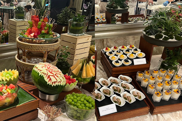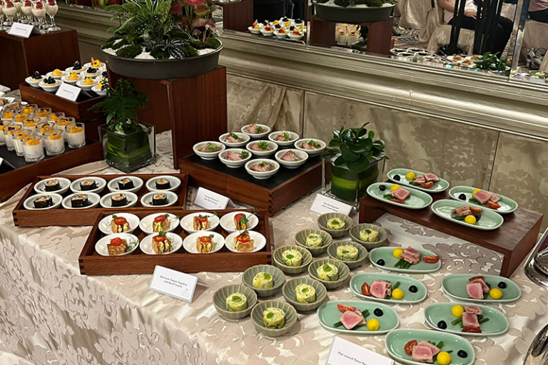酒店提供多款套餐菜單、自助餐及便當盒選擇,包括日韓泰中西式,以及素食選項,滿足不同場合和口味需求。其中精緻茶點系列包括菠菜蘑菇芝士蛋餅、炸意大利飯配番茄汁、素吞拿魚椰菜花飯壽司卷、抹茶意大利芝士蛋糕及生酮朱古力布朗尼等,每款茶點都採用新鮮食材製作,兼顧營養與美味。