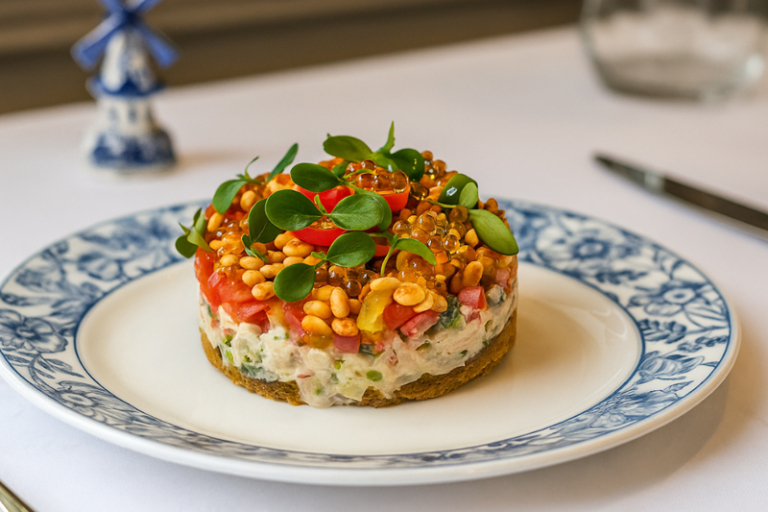 「荷蘭本源 · 蔬食絮語」素食四道菜套餐以精緻的「高達芝士酥皮」作為迎賓小點,選用荷蘭最著名的高達芝士,淡淡的芝士鹹香配與酥脆外皮,瞬間打開味蕾。必試推介「荷蘭傳統番茄馬鈴薯沙拉」,荷蘭馬鈴薯質地細膩綿密,富含澱粉。主廚將香甜的荷蘭原種番茄與綿密的馬鈴薯混合,佐以忌廉芝士、松子、豆瓣菜及白醋珍珠,清新開胃,彷彿置身於荷蘭的陽光農場。