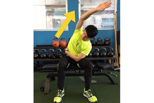 Step 1:坐在穩定的坐椅上,挺胸收腹,一隻手放在腰上,另一隻手向天花伸直。