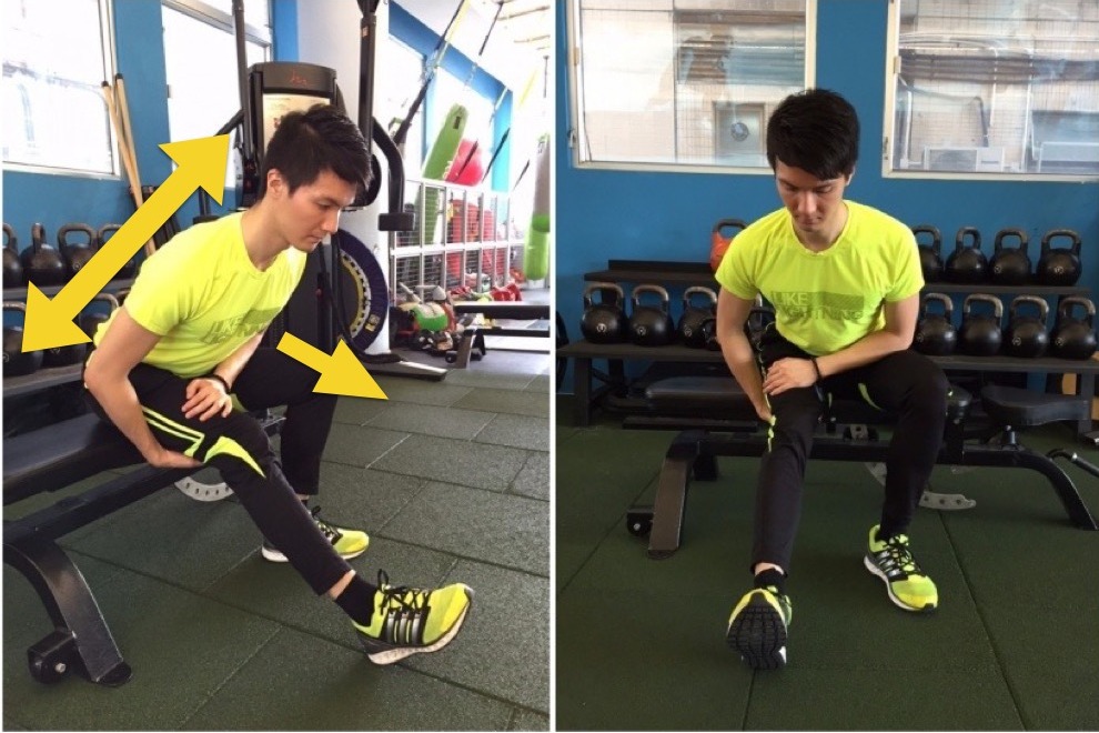 Step 1:坐下,右腳伸前,腳跟貼地,腳尖指向上,膝關節微曲。