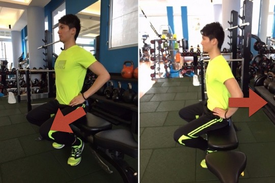 Step 2:右手放在右大腿下,保持挺胸收腹,腰腹慢慢向前伸展至自己的柔軟度,維持約1分鐘,然後換邊重覆。