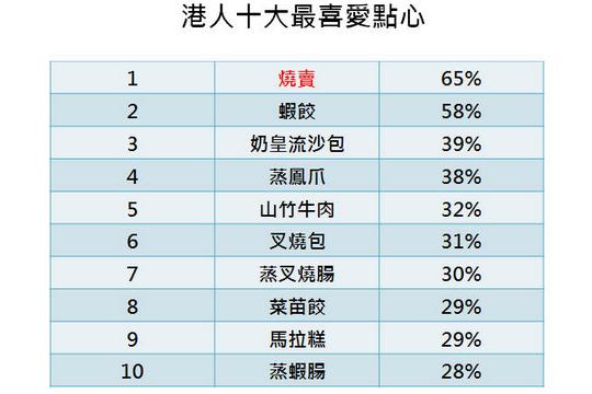 在云云的點心之中,原來香港人最愛吃燒賣,每月平均食5粒,每年便吞近4億粒,堪稱「點心之王」!蝦餃只能屈居第二,第三則是近年非常流行的奶皇流沙包,第四及第五分別為蒸鳳爪及山竹牛肉。