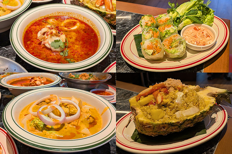 鍾意飯類的話,必揀人氣之選——菠蘿海鮮炒飯(HK$118),份量足,配料豐富,蝦、肉鬆、腰果、粟米、魷魚、菠蘿粒及提子乾,賣相極佳。冬蔭功海鮮湯(HK$88)散發冬蔭的酸辣香氣,非常開胃。另一款必食之選是焗粉絲海鮮煲(HK$138) 則把粉絲、薑蒜、蝦、青口等一同煮香,再拌入濃厚醬汁,以不鏽鋼鍋上桌時香氣會更集中,粉絲亦特別掛汁,啖啖滋味。