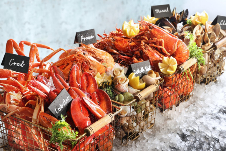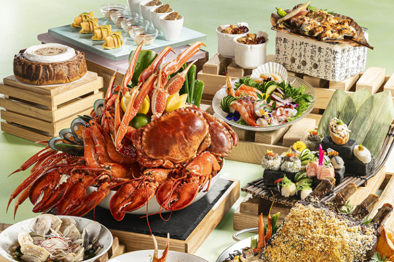經典芝士白汁焗蠔及麵包蟹雙鮮強勢登場,而恆常回本美食包括冰鎮海鮮,鱈場蟹腳、青口、海螺、凍蝦等源源供應;另一邊則設海鮮刺身料理專櫃,廚師即切薄片帶子、紅蝦、鱲魚、赤貝、八爪魚、吞拿魚、三文魚,細膩鮮味各適其式。沙律吧蔬菜款款清脆爽口,多款精選冷盤包括巴馬火腿配蜜瓜、煙挪威三文魚;熱葷方面有豉油皇大蝦、翠綠花姿蝦仁、清蒸沙巴龍躉、荔枝咕嚕肉等。