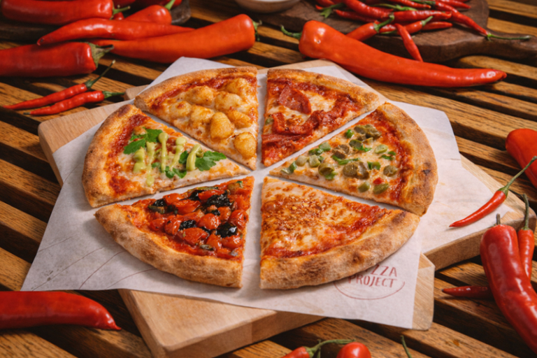 這個四月,The Pizza Project 準備了一場前所未有的薄餅體驗,誠邀各路英雄勇敢挑戰我們的「辣度高牆」。「辣味風火輪」:一個薄餅,六款逐步升級的辣度領域,超適合與好友分享、切磋味蕾承受能力,攀爬我們獨有的「辣度高牆」!「辣味風火輪」辣味薄餅(HK$180),每個薄餅被分成6片切片,每片都以不同的辣醬為主題。團隊採用鮮紅的意式番茄醬作為底料,特意預設把薄餅的靈魂芝士去除,以突出辣醬的風味。薄如蟬翼的香脆,藏著辛辣的驚喜;與摯友相視而笑的窘態,是這片薄餅最對味的佐料。