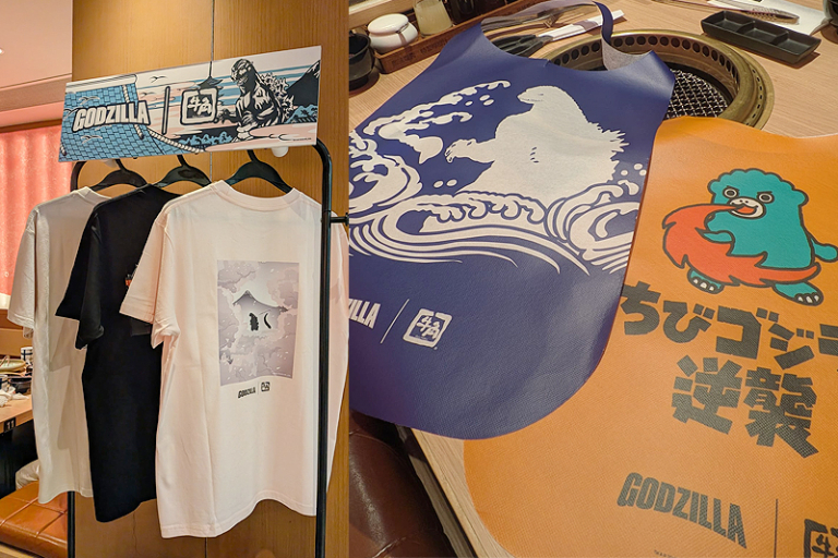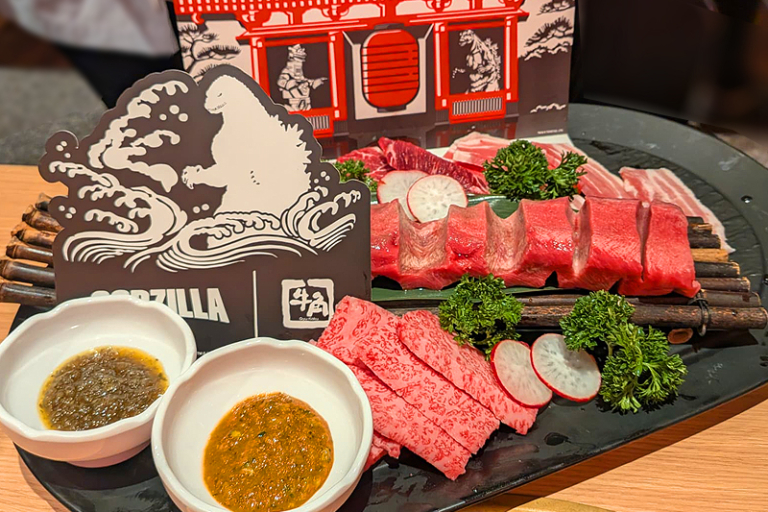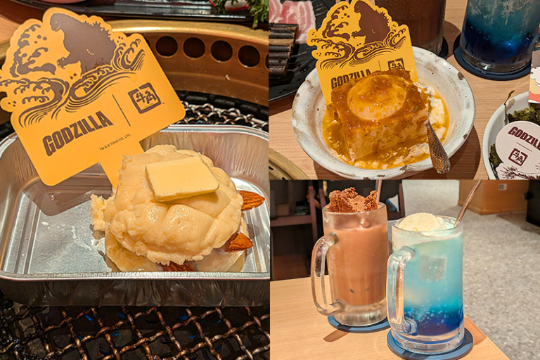 是次聯乘的全新限定餐目,靈感來自哥斯拉最具代表性的特徵、招式及相關詞,包括背鰭、獸爪、吐息、熔岩、螺旋熱線、怪獸聯盟等等,菜式名稱及造型都花足心思,玩味十足。限定餐目由前菜到甜品甚至兒童餐,應有盡有,美味之餘亦非常適合打卡,連烤肉圍裙都變身成哥斯拉及怪獸聯盟限定款。牛角系列的直火燒肉,肉香四溢,配合限定餐目的微辣醬料,與哥斯拉熱力四射的設定相映成趣。牛角、牛角放題實施店、牛角buffet、牛角J,將各有不同限定餐目供應。
