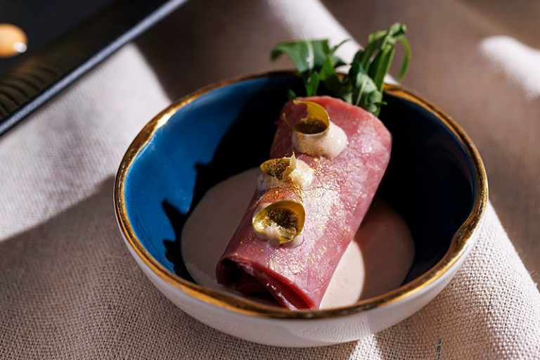 緊隨其後的是可無限續點的前菜,嚴選頂級食材入饌,牛油蜜餞甘筍以本地蜂蜜與牛油拌製,蒜香芝麻菠菜則以醬油與蒜油帶出風味層次,蜜糖芥末和牛粒佐以蜜糖芥末醬,散發焦香與甜辛滋味。驚喜菜式更有鋪上陳年巴馬臣芝士與甜洋蔥的香烤煙肉芝士批、散發濃郁松露香氣的黑松露魔鬼蛋,以及酥脆的越式魚露雞翼,適合與親友共享。