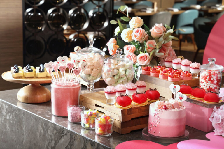 二月的空氣總是彌漫著濃厚情意,香港東涌世茂喜來登酒店的餐廳嶼坊在當日的粵式滋「魅」自助晚餐中特別呈獻豐盛的甜品角落,讓食客以各款甜蜜美點結束浪漫的一日。多元化甜品包括玫瑰紅桑子西瓜蛋糕、檸檬芝士蛋糕棒、紅桑子松露朱古力撻、朱古力士多啤梨、白桃撻等,現場更有主題特調飲品和為食客準備的驚喜小禮物。情人節餐廳2025|明怡美憬閣酒店