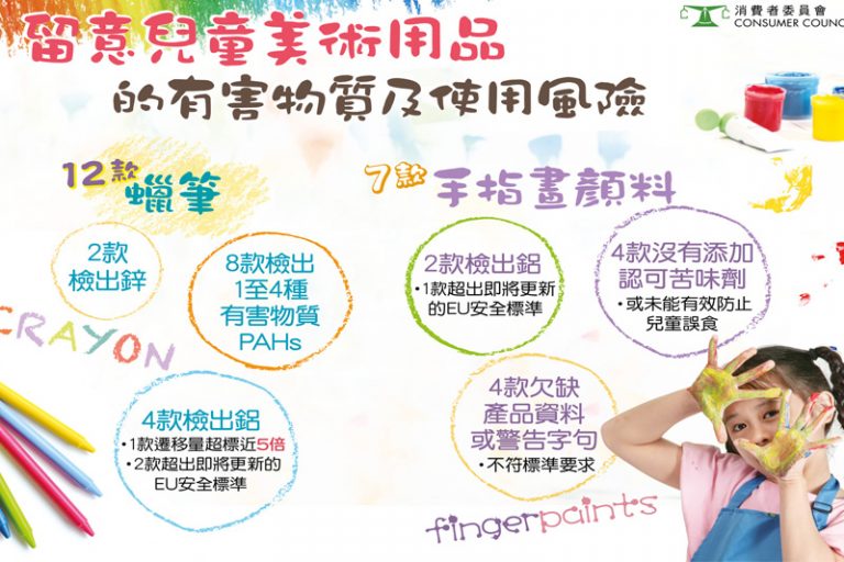 蠟筆和手指畫顏料是小朋友常用的文具,在繪畫過程中,沾了顏料的小手有可能「捽眼捽鼻」,甚或不小心把顏料放入口中,增加攝入有害物質的風險。消委會測試發現,市面上12款蠟筆和7款手指畫顏料,當中多款蠟筆樣本檢出潛在致癌物「多環芳香烴」(簡稱PAHs),其中有2款樣本驗出的萘(Naphthalene)含量超出德國自願性安全標籤計劃的要求上限。