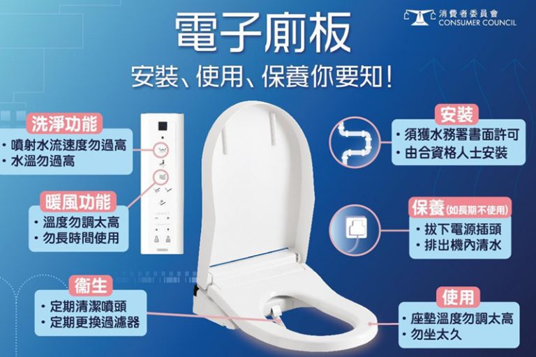 近年,電子廁板愈來愈受大家歡迎。本港市面可供挑選的電子廁板款式亦愈來愈多,到底電子廁板哪款好?在購買智能廁板時,又要注意甚麼地方?消委會搜集了市面9個牌子,合共32款電子廁板的資料進行比較,發現型號之間的售價差別很大,由$3,399至$14,800,而具備的功能亦各有不同,建議市民宜仔細比較,選擇適合自己的款式。