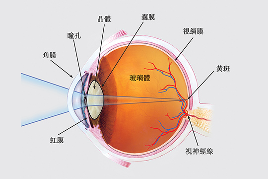 瞳孔是黑眼珠中心部分,就像相機的光圈;虹膜的括約肌和散大肌可控制瞳孔擴大和縮小,從而控制多少光線進入眼內。