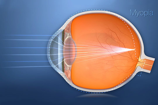 近視是指眼球相對過長,令遠方景物焦點落在視網膜前,所以看近距離物件時清楚,看遠距離物件時模糊。不過,目前對於近視的成因,仍未有正確的解釋,但相信與遺傳、生活環境及閲讀習慣有關。
