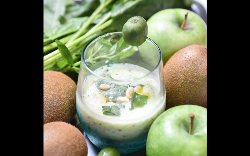 早前法國名廚Charles Soussin來港,不僅示範「雅枝竹時蔬羅勒配奇異果香醋汁」,還創作混合奇異果、青蘋果及羅勒香蒜醬炮製的健宜特飲「綠色蔬果沙冰」。