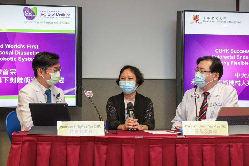 中大賽馬會微創醫療技術培訓中心主任趙偉仁教授解釋:「系統讓我們可以拉高切割平面,提供最佳視野進行黏膜下剝離術。團隊至今已成功運用新技術為6名病人進行大腸ESD,沒有穿孔個案。病人於手術後一天可以開始進食及術後兩天出院。」