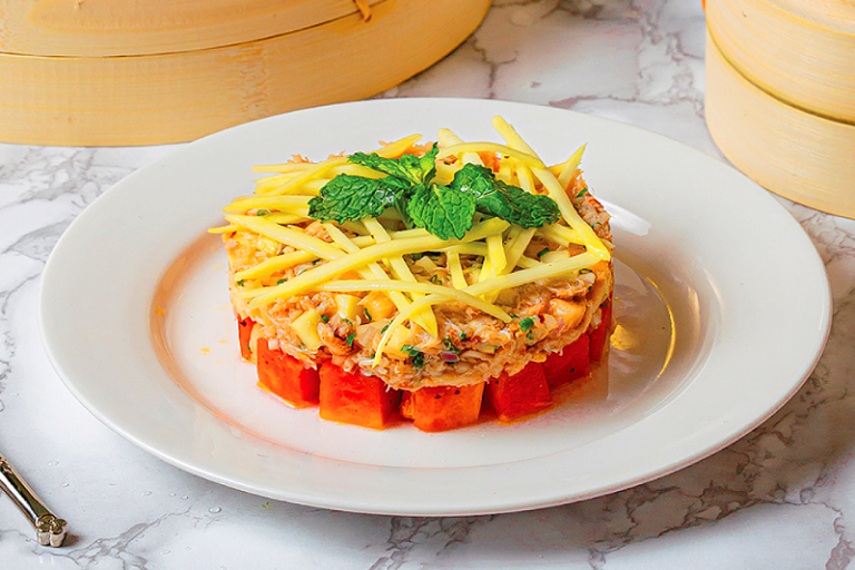 想餐前來點清爽前菜,不妨品嘗熱帶蟹肉沙律(HK$140)。這道沙律以鮮嫩多汁的蟹肉為主角,配上爽脆的芒果、木瓜和哈密瓜,澆上清新的白香醋汁,彰顯出秋日的清新韻味。無論單點還是套餐,食客只需額外以HK$20加配,便可以套餐形式與其他經典菜式一同享用。