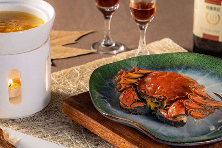 傳統清蒸大閘蟹——嚴選約4兩重的清水大閘蟹。金黃色的蟹黃與蟹膏豐厚多汁,令人回味無窮。清蒸方式完美保留鮮美原味,展現大閘蟹的極致風味。蟹黃花彫溏心雞蛋——香醇的花雕溏心蛋,充滿酒香,味道濃郁。配上甘香的蟹黃,醬香及酒香同時在味蕾爆發。