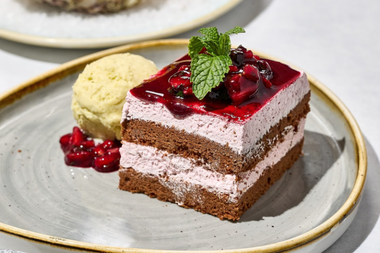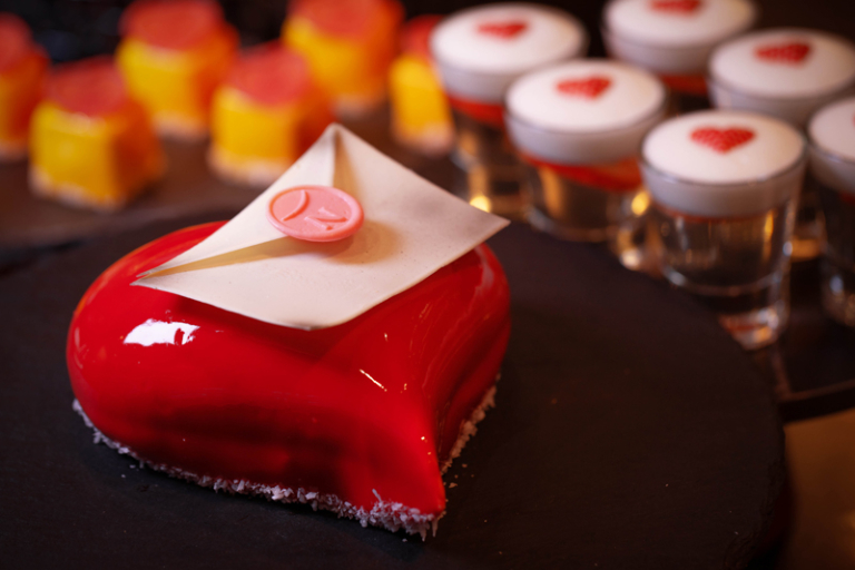 晚餐在甜蜜浪漫的尾聲中作結,情侶將一同分享士多啤梨朱古力蛋糕,配開心果雪糕。經典不敗的朱古力魅力遇上酸甜迷人的士多啤梨,再以堅果香氣濃厚的開心果雪糕為整道甜品添上一抹高雅氣質,將情人節的甜美、心動與儀式感濃縮於最後一匙,共同享用,甜入心底。