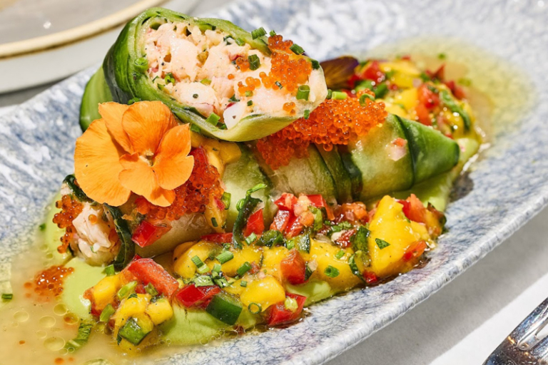 今個情人節,Quiero Más特別為兩位而設的七道菜情人節晚餐將於2026年2月14日(星期六)供應,每套定價HK$1,288(兩位用),設有兩個用餐時段。餐單以味道及氛圍多重層次,細膩演繹「愛」的語言,讓情侶於這一晚全然投入,只專注眼前所愛。情人節晚餐以四款共享前菜揭開序幕,邀請情侶一同前傾細嚐,在你一口我一口之間拉近距離。賣相精緻的龍蝦千層卷,以爽脆青瓜片層層捲起,內藏鮮甜龍蝦肉,搭配細滑牛油果醬,及充滿熱帶風情的芒果墨西哥辣椒莎莎,口感清新、鹹香與果香交錯,將海洋氣息化成愛意前奏。