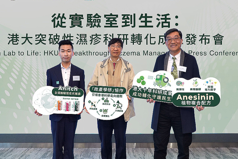 濕疹(異位性皮膚炎)是香港最普遍的皮膚疾病,每五位市民便有一位受其影響。多年來,數十萬患者身陷「發作不斷、痕癢難耐、用藥成癮」的困局,不但睡眠受擾,更對心理造成沉重負擔。香港大學團隊成功研發出植物複合配方「安思靈」,該技術的突破性在於從源頭阻斷其引發痕癢、炎症及破壞皮膚屏障的毒力。這種作用機制有助打破濕疹的惡性循環,同時避免了使用抗生素產生抗藥性的風險,為患者提供了一個安全、可持續的長期管理新選擇。
