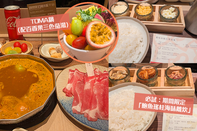 當中TOMA鍋(配百香果三色茄湯)HK$108,主食材包括豚梅肉150g,東港城店限定的湯底,特別加入百香果提鮮,佐以大量完熟番茄碎粒與蒜香,酸甜交織,絕妙開胃。滾起後加入附上的「百香果與三色茄」,演繹出其他分店無法複製的清新旬味。推薦以升級價追加「三色茄」,或者「三重芝士玉子雜炊」,享受自煮的儀式感,讓濃郁芝士與果酸湯底完美邂逅,是品嚐這道鍋物的最高享受。