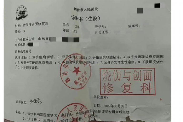 據了解,由於文靜的傷情嚴重,於是救護人員直接安排送她到濰坊市人民醫院燒傷急診科搶救。經過醫生會診後,「文靜被確診為特重度燒傷,燒傷總面積高達95%,其中三度燒傷就有90%。面對女兒嚴重的病情和高昂的治療費,我不知道該如何是好,能做的就是強忍悲痛,想辦法籌錢去救她」。