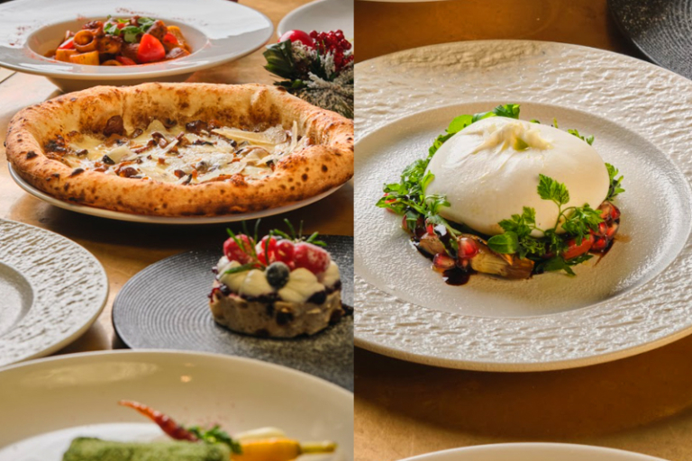 Vesu Pizza Bar 坐落於北京道一號的 30 樓,主打充滿活力的「BITE、SIP、SHARE」的氛圍。而Vesu Pizza Bar準備了別具特色的菜單,提供滋味無窮的兩道菜套餐(HK$228)或三道菜套餐(HK$288)。節日菜單由精緻頭盤開始,例如「布拉塔芝⼠配帕瑪⽕腿」、「拿坡里炸薄餅球佐海膽與雅枝竹」,以及「生牛肉他他」等菜式。主菜則可享用 Vesu 正宗拿坡里薄餅,從火辣的「意式香腸薄餅」、「帕馬火腿薄餅」,到升級尊享的「A5 和牛薄餅」 (另加港幣$128) 及 「香烤澳洲⾁眼⽜排薄餅」 (另加港幣$188)。最後以經典的「意大利芝士蛋糕」或「意大利聖誕麵包」,為非凡的用餐體驗畫上完美句號。