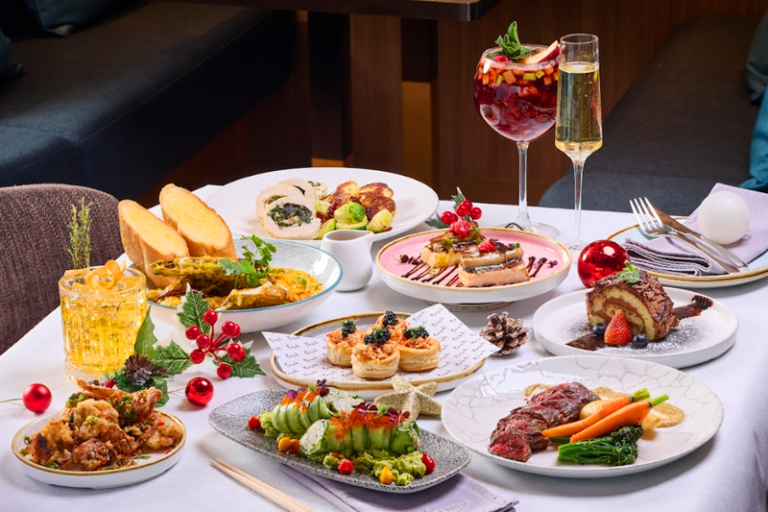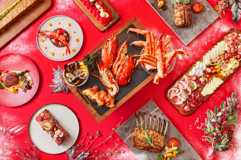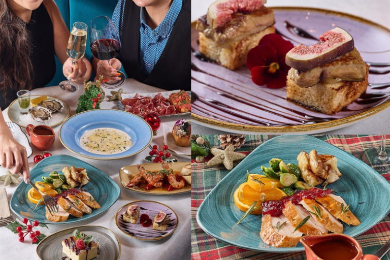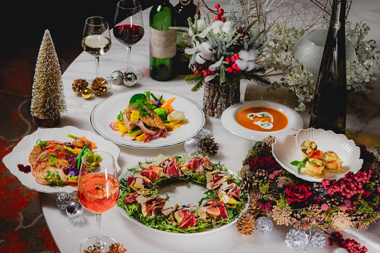 精選菜式包括蟹肉意粉卷搭配牛油果慕斯,以嫩滑鮮甜的蟹肉混合香草,細膩地包裹於意粉薄卷之中,配上絲滑牛油果慕斯,營造入口即化的絕佳口感;龍蝦酥盒配黑魚子醬選用鮮嫩多汁的龍蝦肉為主要食材,搭配香濃忌廉醬汁,填入鬆脆的酥皮盒中,口感層次豐富。酥盒頂部點綴珍貴的黑魚子醬,為整道菜增添高貴鹹香的氣息。香煎鵝肝,配鬆軟布莉歐牛油麵包及無花果醬;慢烤火雞雞胸肉,配抱子甘藍、烤馬鈴薯及甜酸蔓越莓醬;濃郁大蝦蛋忌廉咖喱搭配香脆法包;香煎乾式熟成和牛腹肉,伴紅酒醬及有機蔬菜,或是紅咖哩燉蔬菜;朱古力聖誕樹幹蛋糕,搭配綿滑雲呢拿雪糕。
