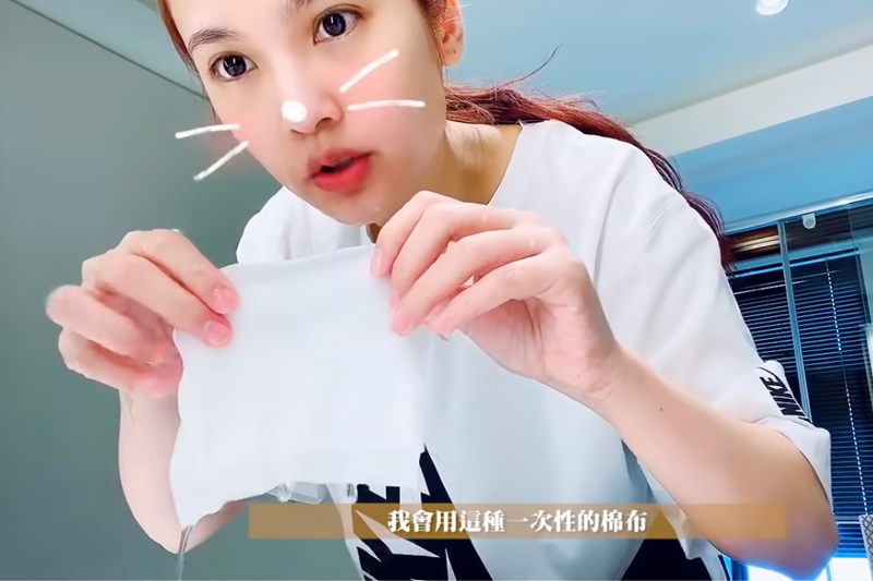 楊丞琳說:「我會用這種一次性的棉布洗臉,不用毛巾的,因為比較衛生,我也怕滋生細菌。」她先把紗布弄成一小塊,再沾濕並在臉上輕輕擦拭,連眼頭也要擦乾淨。