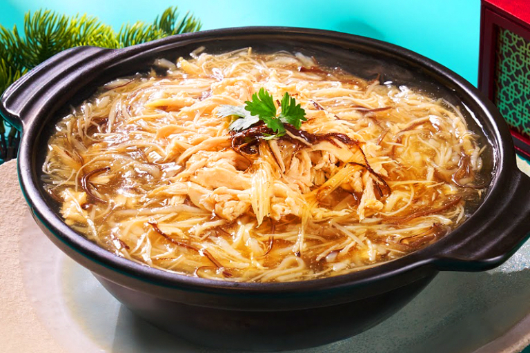 順德拆魚羹以絲滑的活鯽魚為湯底,加入木耳、茭白、勝瓜及車厘茄等時令食材,帶來清新天然的植物甘甜與豐富口感。嫩滑的筍殼魚塊增添層次,而細緻的檸檬葉末則為整道魚羹注入芳香的尾韻。這道湯品清雅而不失複雜,完美展現順德菜的細膩與匠心。