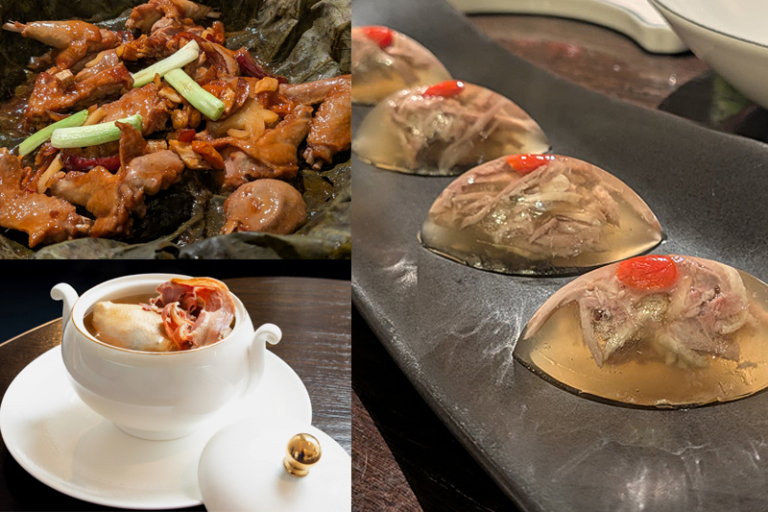 鍾師傅在11道菜中使用了四種不同重量與年齡的鴿子 —「鴿王」、「頂鴿」、「大鴿」與「大BB乳鴿」,以最適合的烹調方式來彰顯各異風味,包括醬油鴿撈起(HK$398) 配以清爽柚子、醃蘿蔔絲、青瓜絲與芋頭絲等蔬菜,中和鴿肉的濃香。花雕醉乳鴿 (HK$298) ,花雕優雅的酒香與鴿肉完美融合,香氣在口中延綿。