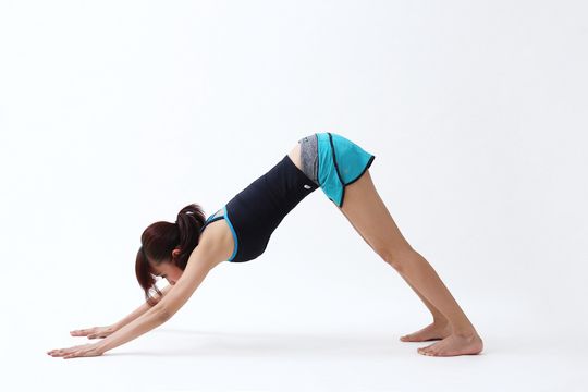 雙手推地,將盆骨往上方推高,腰背伸展,可略彎曲膝蓋,注視自己的腹部,腳跟踩在地板。