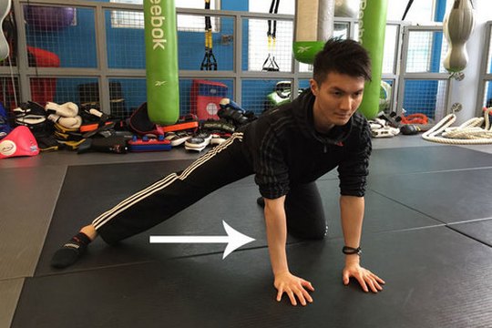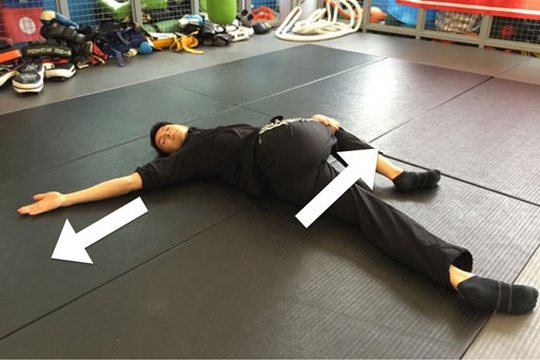 Step 2:將右腿向右伸直,腳尖指向前方,提起臀部。