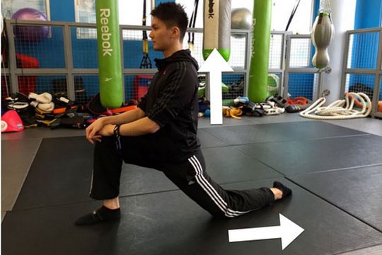 Step1:右腳踏前屈曲成壓腿狀,左腳跪下,然後向後拉。