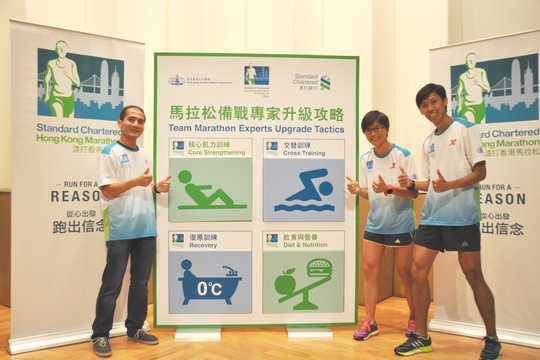 渣打香港馬拉松2014的報名程序正進行得如火如荼,不少跑手已開始積極備戰。8位「馬拉松備戰專家」容樹恆醫生、楊世模博士、雷雄德博士、麥耀光醫生、林思為小姐、周子雁小姐、賴學恩先生及陳家豪先生亦藉此機會特別與跑手們分享「長跑4寶」:「核心肌力訓練」、「交替訓練」、「復原訓練」及「飲食與營養」,助參賽健兒「跑」上成功之路。