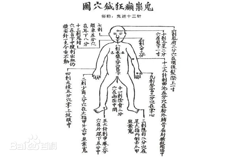 讓我簡介一下鬼門十三針,此乃古老針法,由唐代孫思邈真人所創,當時用治顛、狂和癎症。古人認為精神病者皆因鬼神作崇,故所用的穴位稱為十三鬼穴。紮針時禁忌較多,必須在日間進行,乃因十三針所治的屬陰邪所致之病,所以日落後絕不宜施針。施針過程須順著一定次序,由第一針紮至第十三針,每施一針都會問附在患者身上的附靈一些問題,如是何方鬼神?為何侵擾患者?目的是想透過溝通為人鬼之間作和解,消除彼此恩寃。若附靈堅持死纏患者,醫師當下便須決定是否紥至最後一針的鬼封穴,此穴可直接將附靈打散至灰飛煙滅。