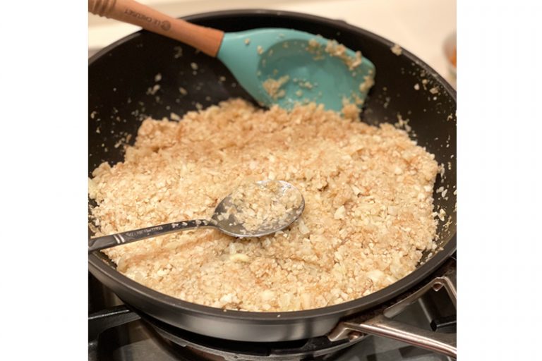 6. 在易潔鑊中,放入花椰菜粒、洋車前子粉及調味料,加入冬菇水或瑤柱水去增加黏度,以中火炒至開始變黏備用。