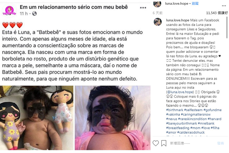 今年3月美國有一名女嬰路娜 (Luna Fenner)出世發現臉上長有一大塊黑色胎記,面積覆蓋了鼻子、雙眼、兩邊臉頰。幸好掃描後證實並非癌變,而是先天性巨型黑色素痣(Giant Congenital Melanocytic Nevus,GCMN)。胎記是由黑色素細胞,而Luna的胎記就集結成直徑大於20厘米的大痣。