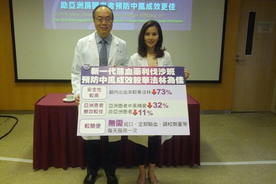 雖然「華法林」的限制較多,但薄血藥的藥效確實有助預防房顫病人中風,中大內科及藥物治療學系腦神經科主任黃家星教授(上圖)遂就薄血藥成效展開研究,抽取了內地、香港、台灣及韓國四個亞洲地區共932位患者的數據,與非亞洲地區的病人數據進行比對研究,發現新薄血藥「利伐沙班(rivaroxaban)」能降低亞洲地區房顫病人的中風風險32%。