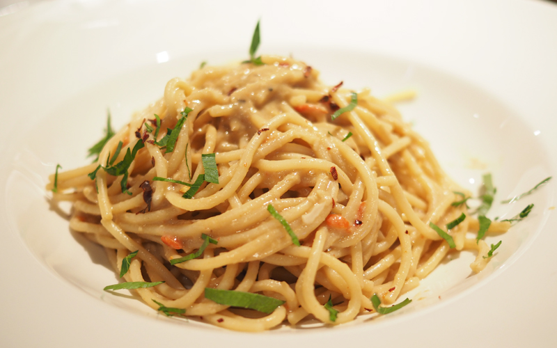 另一款JUST 植物蛋意粉用JUST 植物蛋漿,混和蘑菇醬配製而成的特別醬汁烹煮,質感能做到卡邦尼意粉的creamy效果。因為拌入甜椒、番茜同煮,味道不算太清淡,並帶有強烈的煙燻味道。