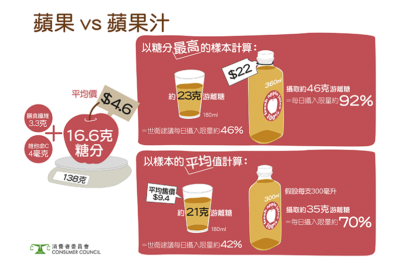 糖含量方面,測試發現全部樣本每100毫升就有超過5 克糖,即多過一茶匙糖。其中蘋果汁及含蘋果汁的混合果汁樣本的糖含量最高,每100毫升達6.7至12.9克。以糖含量最高的樣本計算,飲一枝360毫升的果汁,攝入的糖含量達46克,即超過9 茶匙糖,是成年人平均每日攝取糖上限的92%。