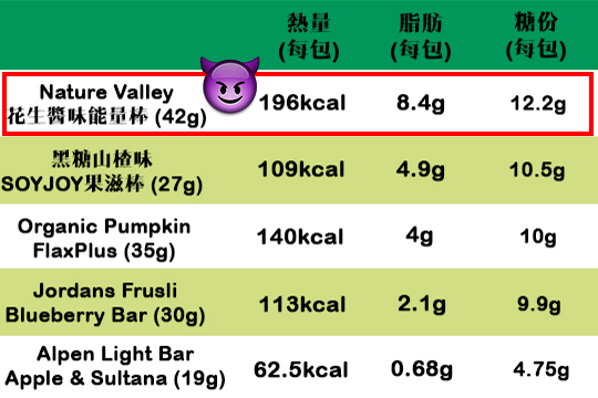 當中以花生醬味的能量棒最邪惡,每100克就含有20克脂肪和29.1克糖份,根據食安中心指引屬於高脂食品,糖份更是超出高糖食物指引的 4倍!