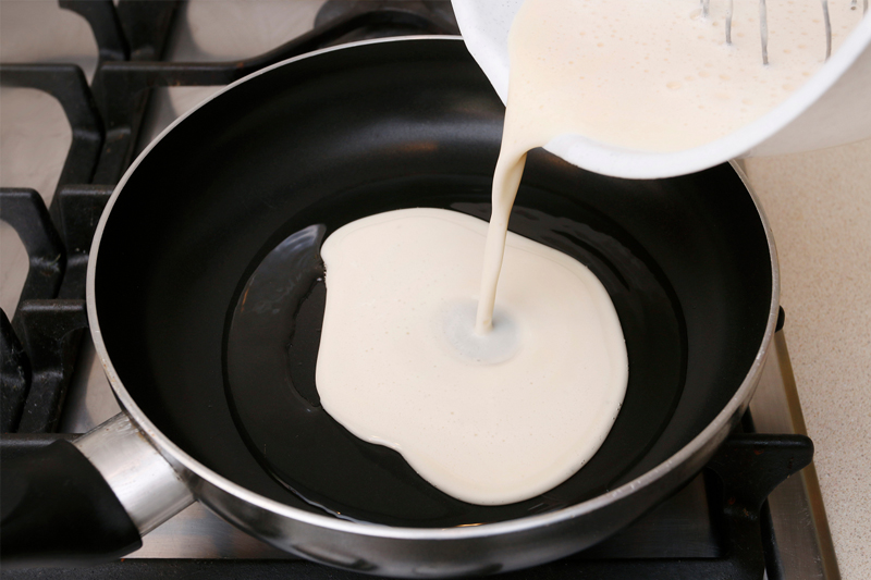 在平底鍋表面掃上油,倒入適量粉漿,以中小火煎出泡泡。