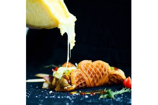 難以抵擋的「芝」味!拉芝窩夫熱狗,用即製熱辣辣窩夫夾住煙肉、腸仔和秘製辣牛肉,再淋上超量熱溶芝士,拉芝效果爆登。
