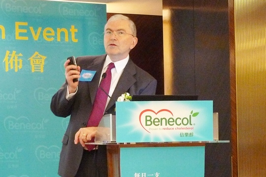 中文大學內科及藥物治療學系湯寧信教授(Prof. Brian Tomlinson,上圖)指出,心臟病是本港第2號殺手,去年奪走逾六千港人性命,佔全港死亡數字14%。70%的心臟病個案屬於冠心病,而膽固醇過高會同時誘發血管疾病、冠心病、甚至中風。研究資料顯示,超過四成香港人膽固醇水平偏高,尤其是低密度膽固醇(LDL,俗稱壞膽固醇)。