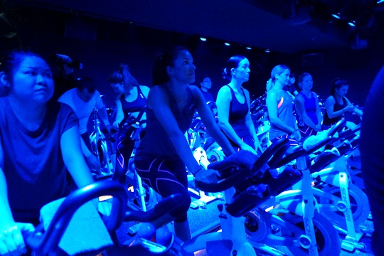 有別於一般健身室的光猛,XYZ的環境黑漆漆的,內有迷幻藍色暗燈,讓人以為自己身處Disco。加上教練利用節奏明快的音樂拍子來帶動踏單車的節奏,時而加快,時而減慢,還會逐漸把腳踏阻力調高,讓運動難度慢慢提升。有時候教練還會要求你屁股離開座位,凌空踏單車,維持一段時間後再重新坐下。這樣強弱交錯的運動方式(Interval Training),對燃燒脂肪十分有效。