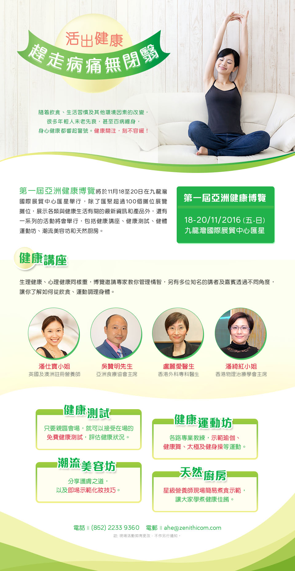 第一屆亞洲健康博覽將於11月18至20日在九龍灣國際展貿中心匯星舉行,除了匯聚超過100個攤位展覽攤位,展示各類與健康生活有關的最新資訊和產品外,還有一系列的活動將會舉行,包括健康講座、健康測試、健體運動坊、潮流美容坊和天然厨房。