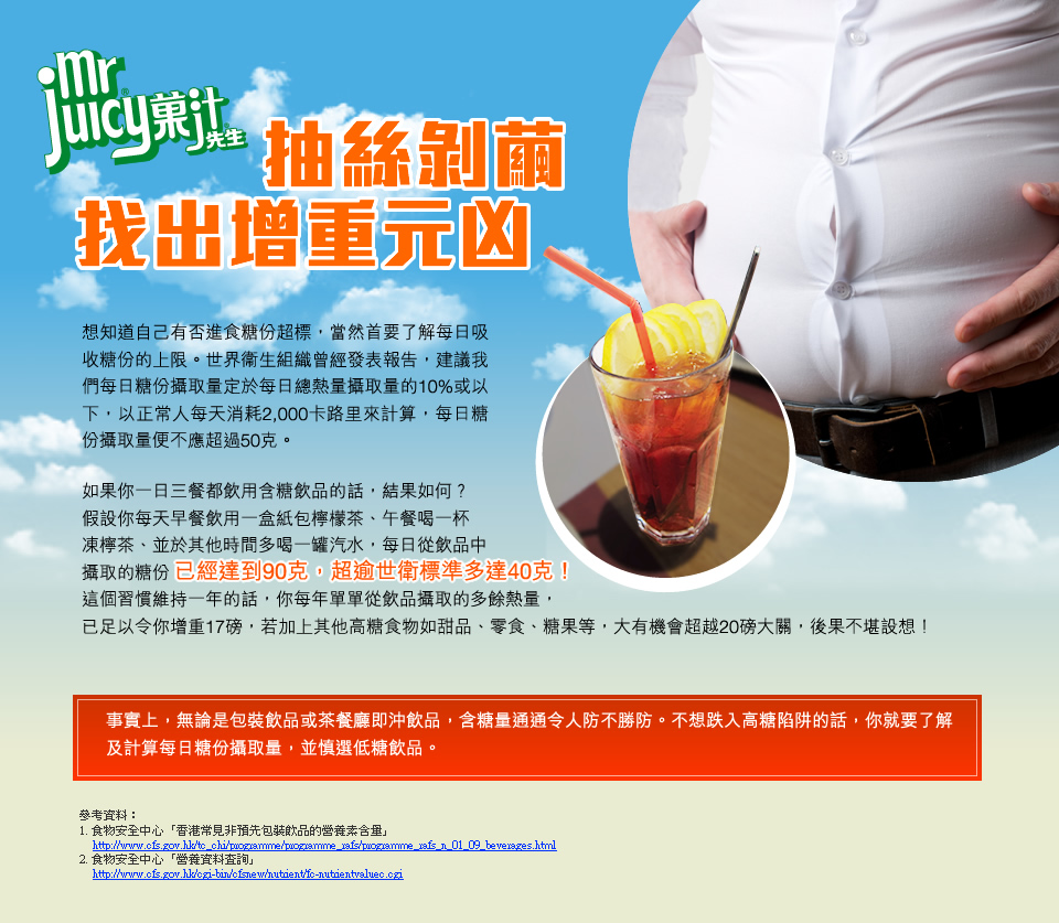 如果你一日三餐都飲用含糖飲品的話,結果如何?假設你每天早餐飲用一盒紙包檸檬茶、午餐喝一杯凍檸茶、並於其他時間多喝一罐汽水,每日從飲品中攝取的糖份已經達到90克,超逾世衛標準多達40克!這個習慣維持一年的話,你每年單單從飲品攝取的多餘熱量,已足以令你增重17磅,若加上其他高糖食物如甜品、零食、糖果等,大有機會超越20磅大關,後果不堪設想!