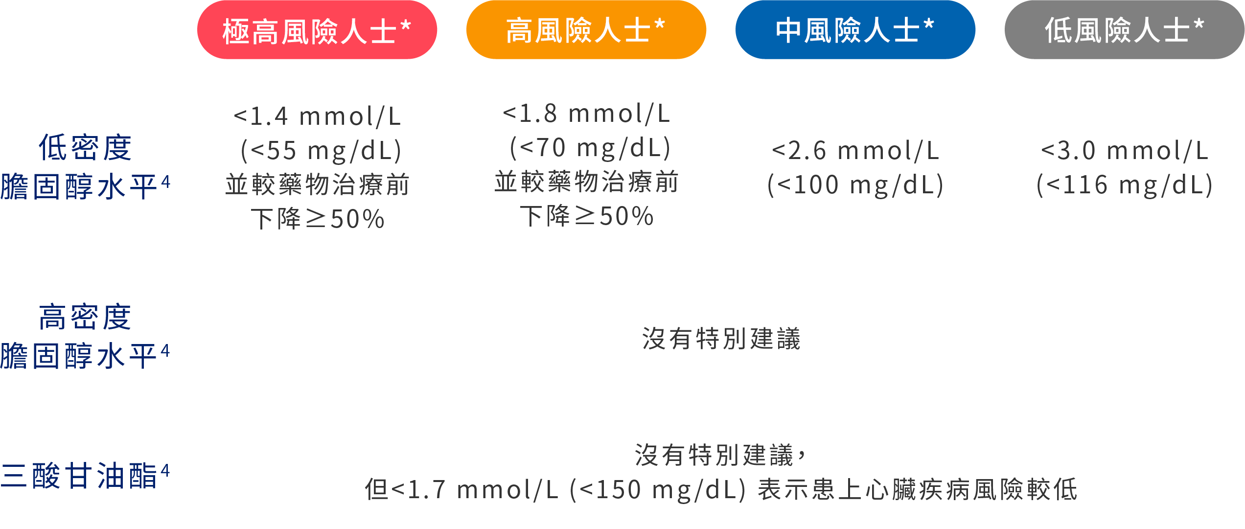 極高風險出現心血管疾病的情況,包括:曾有動脈粥樣硬化心血管疾病(無論臨床表現或影像學上明確的表現:曾出現急性冠狀動脈綜合症(心肌梗塞或不穩定型心絞痛)、穩定型心絞痛、冠狀動脈血運重建(經皮冠狀動脈介入治療、冠狀動脈繞道手術和其他動脈血運重建手術)、中風和短暫性腦缺血發作以及周邊動脈阻塞性疾病;影像學上明確記錄的動脈粥樣硬化心血管疾病,包括已知可以預測臨床事件的發現,例如冠狀動脈造影、電腦斷層掃描(兩條主要心外膜動脈狹窄率>50%的多支冠狀動脈疾病)或頸動脈超音波檢查發現的明顯斑塊;患有糖尿病並出現微量白蛋白尿、視網膜病變或神經病變,或有≥3主要風險因素,或患有早發性一型糖尿病長達>20年;重度慢性腎病(eGFR <30 mL/min/1.73 m2); 患有家族性高膽固醇血症及動脈粥樣硬化心血管疾病或其他主要風險;10年內出現致命心血管疾病的風險≥10%。